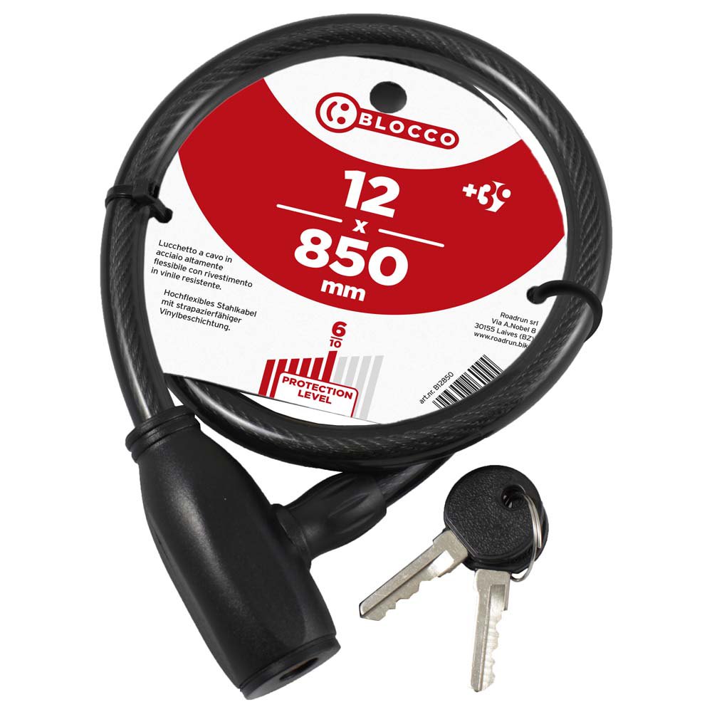 Con llave ˜ 12 mm – 85 cm de largo – nivel de seguridad:6.Cable de acero de alta flexibilidad con revestimiento de vinilo resistente.Nivel de seguridad: 6.Longitud: 85 cm.