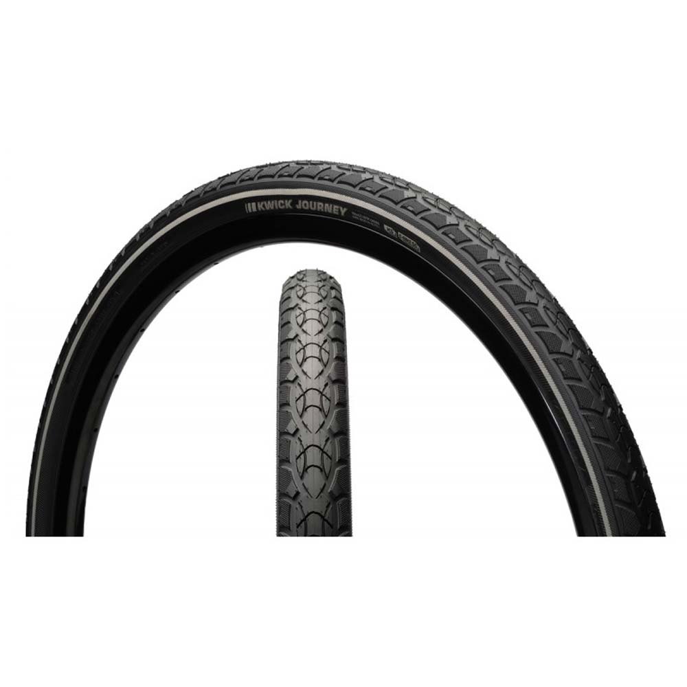 ¿Siempre en la carretera y sin tiempo para pisos? Desde el carril bici hasta las calles de la ciudad, desde la línea de la ciudad hasta la plaza del pueblo, no hay ruta que no pueda tomar con este neumático de trekking confiable y de rodadura rápida. El Kwick Journey fue diseñado para todos los caminos por los que te llevará tu viaje. Construido para durar con una pared lateral reforzada y protección K Shield o K Shield Plus y aprobado para su uso hasta 50 km / h, este neumático está realmente hecho para su viaje.Características:Opciones K Shield y K Shield Plus mejoradas disponibles para una protección confiable contra pinchazos.Entalladuras profundas para canalizar el agua en condiciones de humedad y perillas moleteadas en los hombros para brindar confianza en las curvas.Sea visto Cinta reflectante en las paredes laterales para una mejor visibilidad nocturna.Listo para bicicletas eléctricas Este neumático fue certificado según la norma ECE R75 y está aprobado para su uso en bicicletas eléctricas de hasta 50 km / h.Tecnología de neumáticos:Compuesto de caucho estándar (Src):El compuesto de caucho estándar combina los mejores atributos de baja resistencia a la rodadura, alta durabilidad y longevidad de la banda de rodadura en un paquete universal que beneficia a los ciclistas desde los desplazamientos diarios hasta los viajes de fin de semana.K ESCUDO + (KS +):Aumentamos el grosor del K Shield a 5 mm para crear el mejor equilibrio entre pruebas planas y mantener una excelente calidad de conducción. Para cualquiera que busque hacer un esfuerzo adicional.BICICLETA E 50KPH (E 50):Indica que el neumático ha pasado la certificación ECE R75 E Bike para bicicletas eléctricas con velocidades de hasta 50 kilómetros (30 millas) por hora.ESCUDO K (KS):Una capa de 3 mm de caucho ligero y flexible que contiene aramida y partículas de cerámica dentro del neumático solo debajo del área de la banda de rodadura. Diseñado para prevenir pinchazos y aumentar la vida útil de los neumáticos.