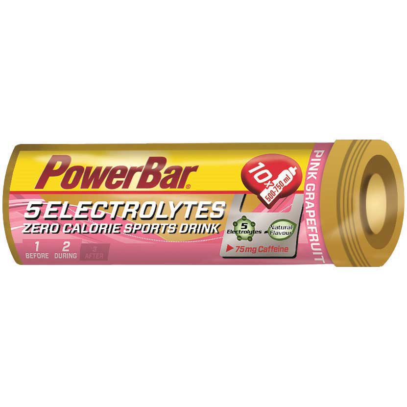 Bebida isotónica para deportistas con 5 electrolitos, sin calorías y sin azúcares, 100% refrescantesDetalles del producto- Sin azúcares – Sin calorías- Las tabletas se disuelven sin dejar gas. Con 10 tabletas se pueden mezclar hasta 7,5 litros de bebida isotónica- 5 ELECTROLYTES: sodio, cloruro, potasio, magnesio y calcio- Aromas naturales con un sabor refrescante y afrutado- Sin aspartamo ni conservantesSobre este producto:Muchas personas que practican deporte o hacen ejercicio desean tomar una bebida deportiva que no les aporte hidratos de carbono adicionales, con el fin de optimizar el metabolismo de grasas o bien reducir su ingesta total diaria de calorías. En numerosas ocasiones recurren al agua, pero al hacer deporte sudas y el sudor contiene agua y electrolitos, que cumplen funciones vitales en el cuerpo.Con las tabletas PowerBar 5ELECTROLYTES puedes hacer tus propias bebidas isotónicas para deportistas sin calorías, para aportar a tu cuerpo los 5 electrolitos principales en la proporción en la que se pierden a través del sudor. Ideal para entrenar tu resistencia básica y mantenerte hidratado, sin añadir hidratos de carbono ni calorías- 5 ELECTROLYTES (sodio, cloruro, potasio, magnesio y calcio) en la proporción en la que se pierden a través del sudor.- Los sabores Pomelo rosa y Limón y tónica boost contienen 75 mg de cafeína por ración, que pueden potenciar el rendimiento mental.INGREDIENTES:Acidulante (ácido cítrico), corrector de acidez (carbonatos de sodio), sales minerales (14,7%) (cloruro potásico, carbonato cálcico, cloruro sódico, hidróxido de magnesio, fosfatos cálcicos), humectante (sorbitol), inulina, aromas naturales, cafeína (1,80%), almidón, edulcorante (sucralosa).USO RECOMENDADO:- Sugerencia de uso: Disolver 1 tableta en 500 – 750 ml de aguaHidratación general para actividades > 60 minutos:- Beber aprox. 200 – 300 ml en la hora previa a la práctica de deporte- Beber 150 – 200 ml cada 15 minutos mientras se hace deporte- Max.4 tabletas (sabores sin cafeína) y 1-2 tabletas (sabores con cafeína) por día- No exceder la dosis diaria recomendada. Este complemento alimenticio no se debe utilizarse como sustituto de una dieta variada. Mantener fuera del alcance de los niños.- Para sabores con cafeína: contiene cafeína. No recomendado para niños ni mujeres embarazadas.